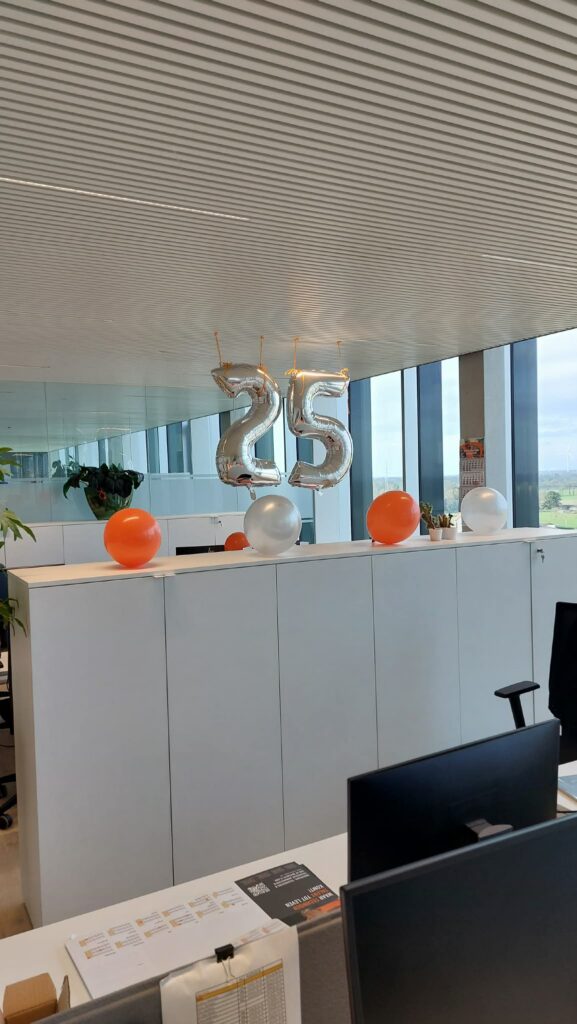 Ze kreeg een mooi boeket van Dries en Jan Tormans en een ‘lekkere’ attentie om haar jubileum achteraf nog eens in stijl te vieren. Om haar te verrassen, versierden de collega’s van kantoor Geel haar bureau en verstopten ze zich voor dag en dauw op kantoor – de ene al wat wakkerder dan de andere 😉 – zodat ze die dag niet alleen was om op te starten. Gelukkig had Sigrid ook voor een lekkere traktatie gezorgd.
